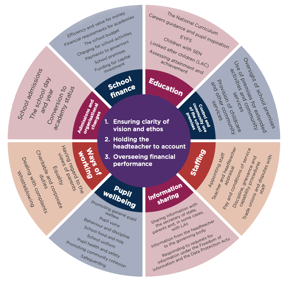 The wheel below shows many of the areas relevant to the governance of schools. It is not an exhaustive list and gives an illustration of the types of experience and skills you might need as a Trustee.
